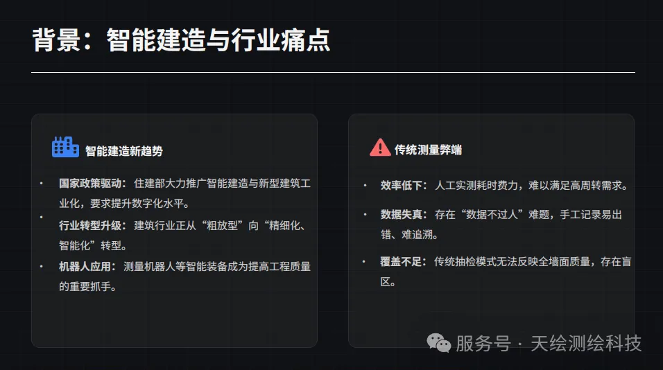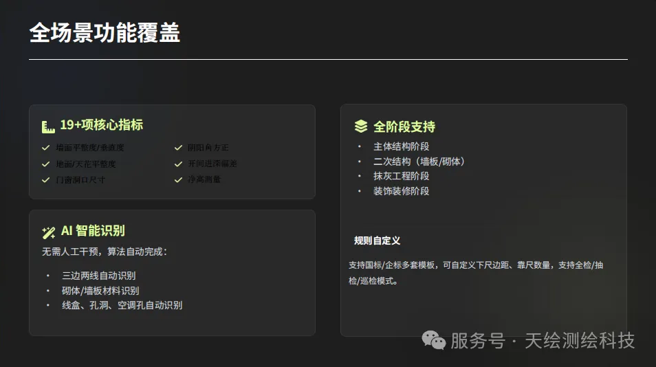 智能高效:实现数据采集、智能分析到报告生成的全流程自动化,大幅提升实测实量工作效率与标准化水平,减少人工误差与返工成本。
